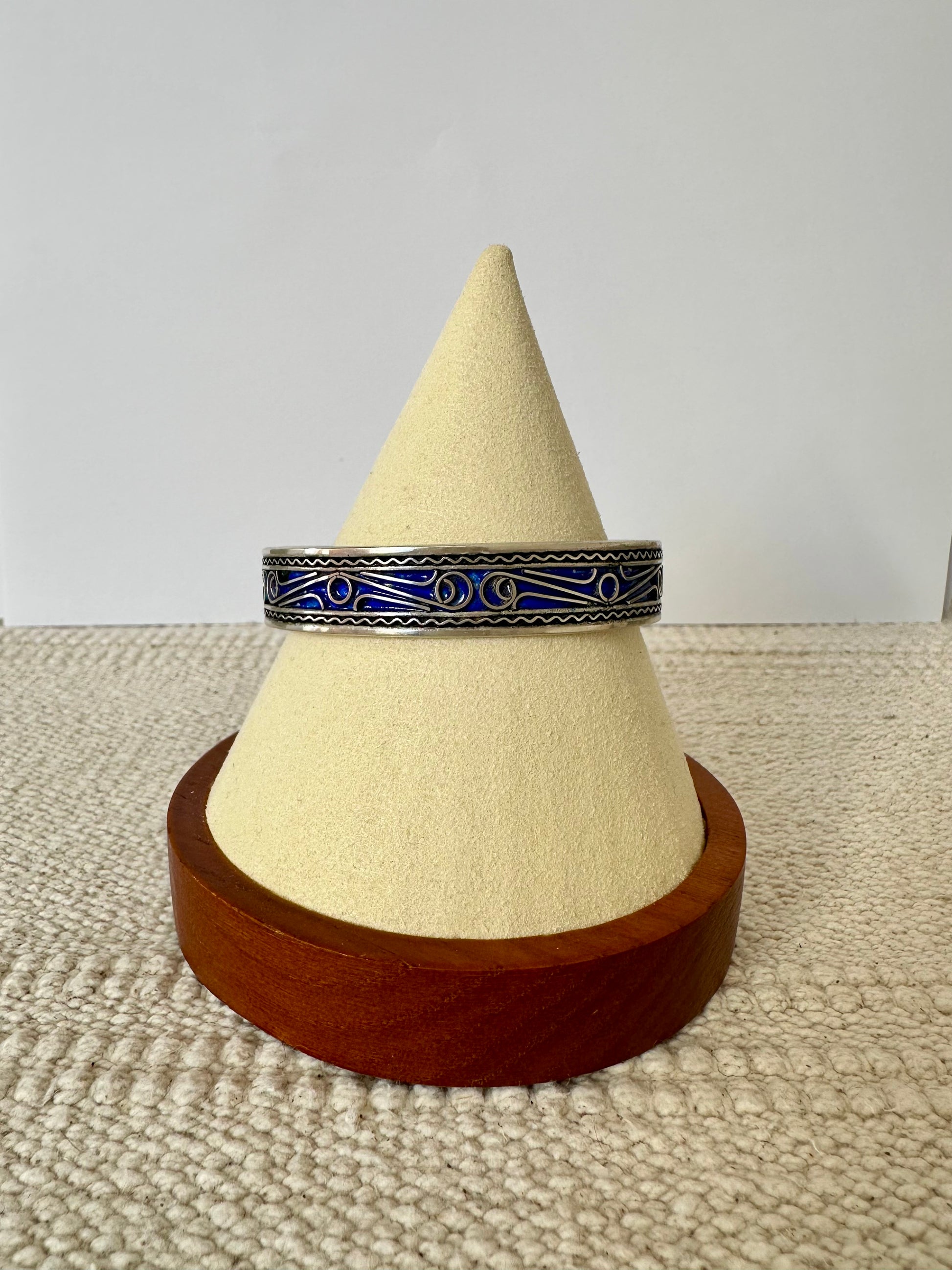 This exquisite cuff bracelet showcases intricate Amazigh-inspired geometric patterns, accentuated with vibrant multicoloured enamel. Each piece is meticulously handcrafted from genuine silver, reflecting the rich heritage of Amazigh artisanship.