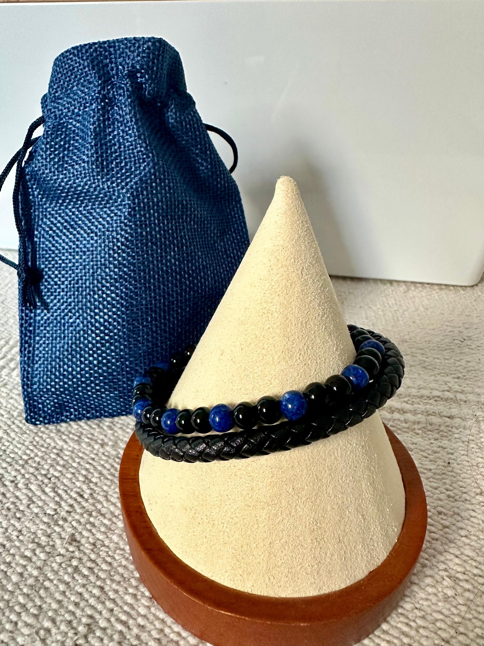 Discover a timeless men’s accessory that blends natural stones with premium craftsmanship. This bracelet pairs a braided black leather strap with round semi-precious beads, creating a sleek and masculine piece designed for everyday wear. Whether you choose the deep blue of Lapis Lazuli or the warm earthy tones of Tiger’s Eye, each bracelet brings its own character and energy — from grounding protection to clarity and confidence.