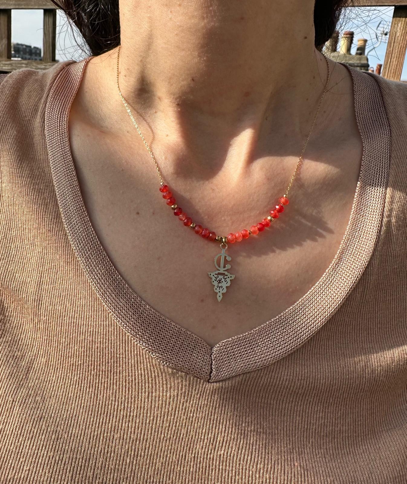 Celebrate heritage and elegance with this Amazigh-inspired necklace, crafted in gold-tone stainless steel and adorned with delicate red pearls. Featuring a central fibula pendant— a powerful symbol in North African culture — this necklace blends cultural meaning with timeless style.