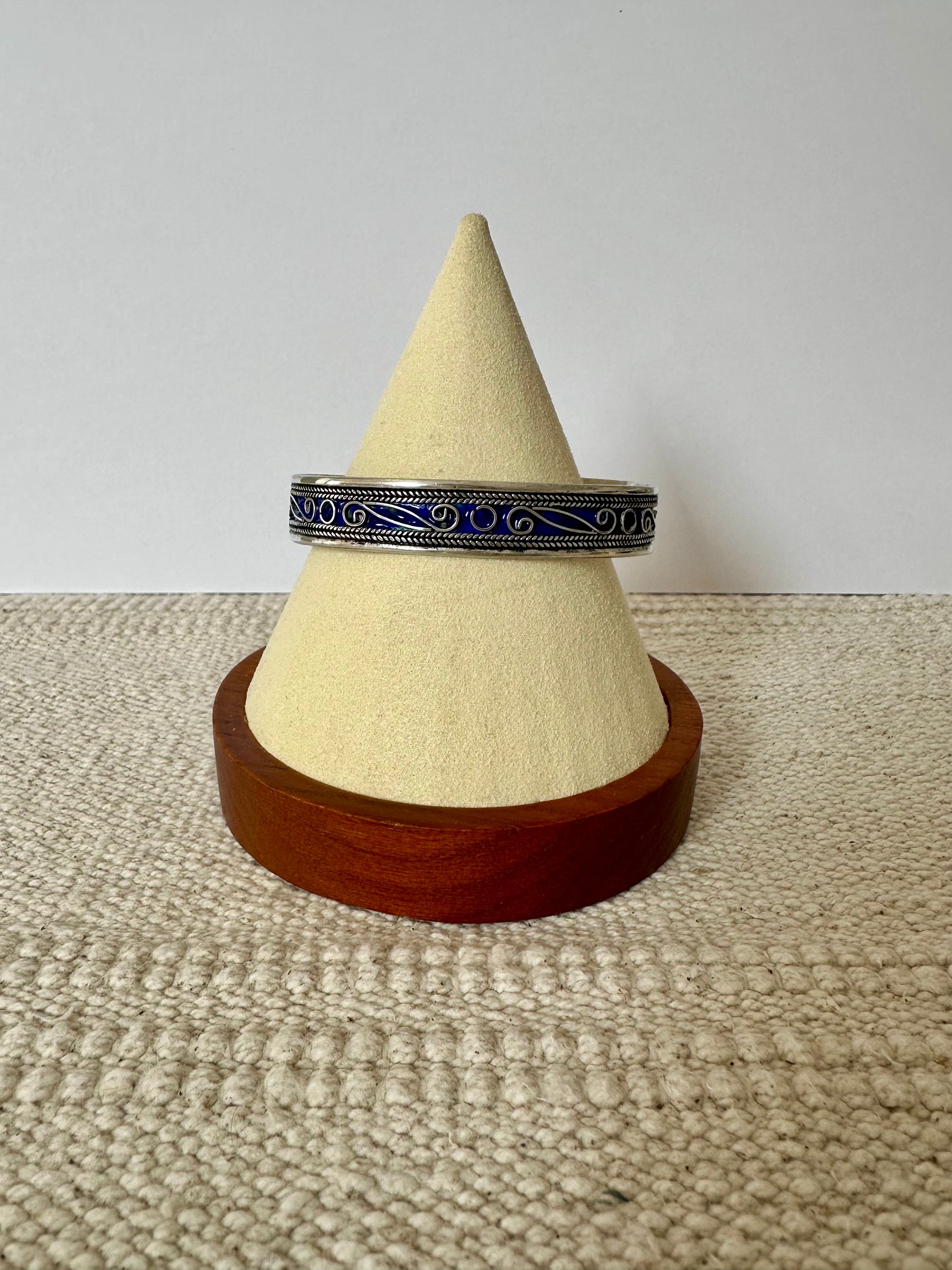 The open cuff design makes this bracelet adjustable, ensuring a comfortable fit. The bold blue enamel adds a touch of sophistication, beautifully contrasting with the polished silver. This bracelet is a perfect reflection of Amazigh culture, combining traditional elements with a contemporary look.